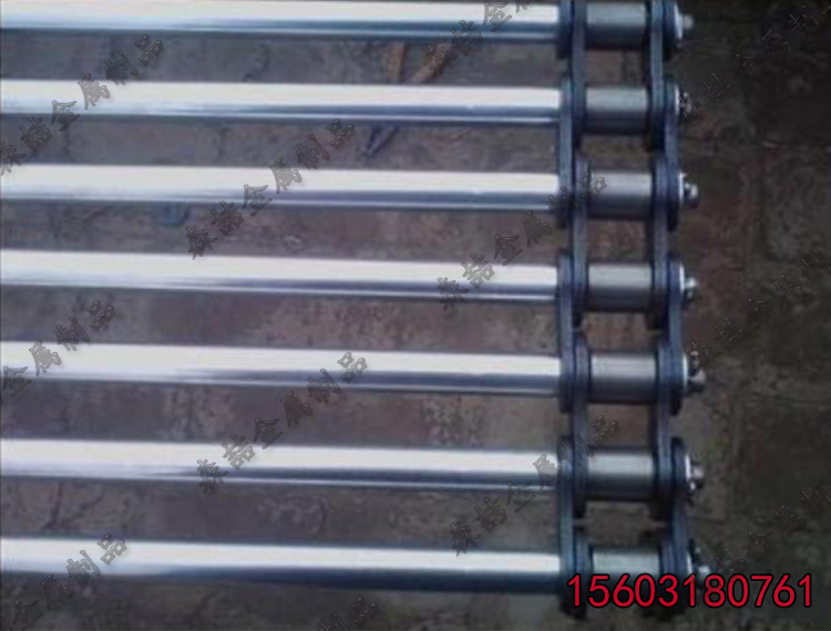陸經理詢問的sz-2串桿輸送網帶總寬度只有400mm,采用(08A)標準型鏈條,與以往的大滾珠輸送鏈不一樣,串桿直 徑采用的是5mm的不銹鋼棍,串桿的間距為25.4mm,兩節鏈條一根串桿,串桿的兩頭需要使用車床進行消磨處理。串桿 網帶的承重能力主要是依靠串桿,在一米的距離內可以安裝40根,完全滿足客戶所要求的一米承載40公斤的需求。