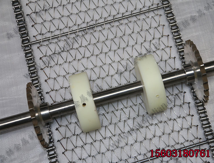 每一種金屬輸送帶都離不開串桿,這也是輸送帶承重能力集中的一部分,串桿的選擇上一定要謹慎,過細的會出現 下垂現象從而影響正常使用。在鏈條網帶的安裝方面有很多要注意的,輸送機的兩端要各安裝一根傳動軸,軸的兩側是兩個驅動鏈輪,鏈輪的節距一定要和鏈條的節距保持一致,被動軸一端要安裝張緊裝置,方便輸送帶安裝和日后的調節。值得注意的是在兩個鏈輪的中間位置一定要安裝托輥來支撐串桿,否則在物料的壓力下串桿及中間網帶會變形,導致網帶輸送機運行不穩。托輥的選擇也是值得注意的,很多客戶選用尼龍材質的,其直徑大小要和鏈輪相配合,其中的尺寸數據也要注意。