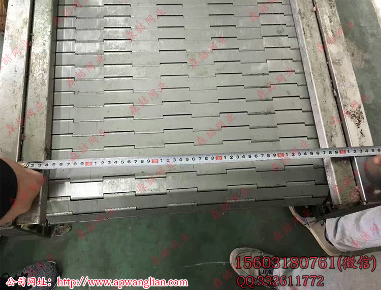 大多數輸送網帶都是依靠兩側的鏈條來傳動,兩側鏈條分別安裝于兩側的軌道之上,一邊的余量大約是7-10mm左右,一般輸送帶在確定寬度數據時可以稍微窄一點,但是千萬不能大于軌道內側寬度,不然無法安裝進去。為了避免出現誤 差我們一般都是詢問網帶包括鏈條的總寬度。確定寬度的時候只要知道軌道內側寬度,然后兩側留余量就行。還有值得注意的是總寬度一定要包括鏈條兩側的穿銷長度。