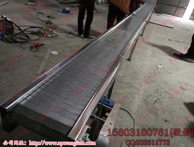 網帶輸送機應用的板鏈線由鋼結構導軌和鋼板鏈及專用滾針鏈條等組成,采用鏈板網帶拖動電機做下上循環平面運轉,以此達到生產工藝要求。鏈網輸送機采用的流水線采用組合式裝配模式,具體數據可根據實際要求加工定做。
