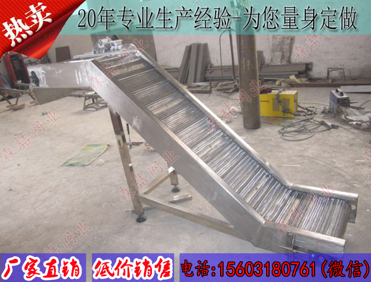 網帶提升機采用不銹鋼網帶作為載體進行輸送,兩側加裝輸送鏈條中間用穿軸相連接,采用鏈輪帶動鏈條從而使輸送帶沿鏈條傳送方向而運行;也可以采用特制的包膠滾筒直接傳動,前者一般適用于物料較重且輸送長度較長的輸送設備采用,用于冷卻、吹干等行業設備的輸送加工,因此網帶網孔一般較大,后者一般采用網孔較小的輸送網帶,適合用于物料體積較小輸送距離短的輸送設備。
